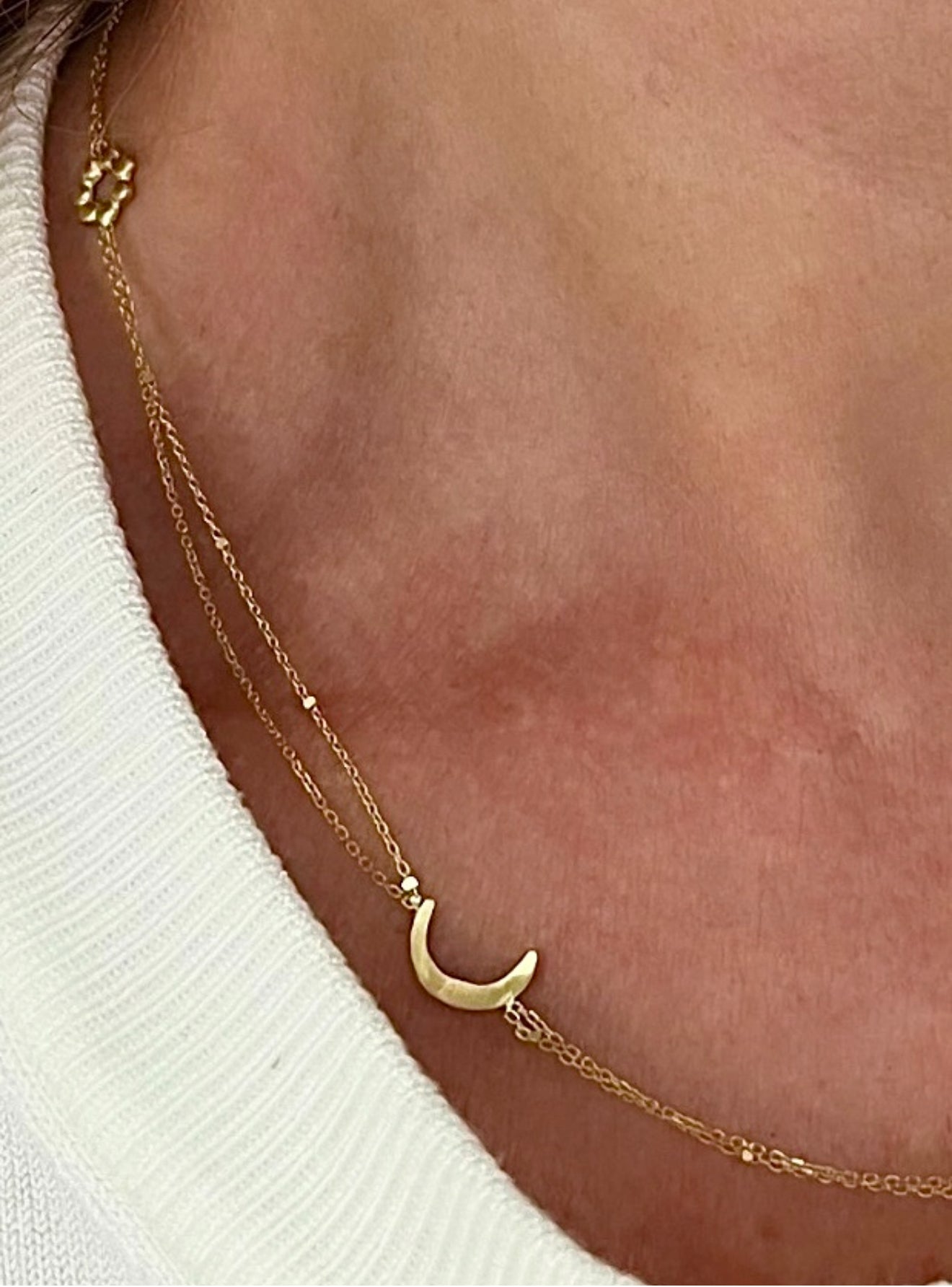 This necklace carries little stories, told through delicate gold icons on a double chain with two contrasting patterns. Each piece dances with its own life when worn — playful, personal, and ever-changing.
